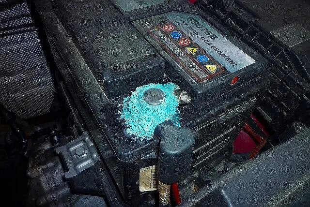 右写真の黒いバッテリーは、とんでもない状況になっていた例。