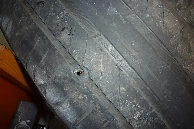 クギかネジがトレッド面に刺さった穴がはっきりと確認できる。