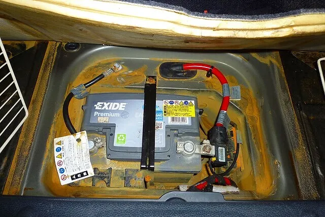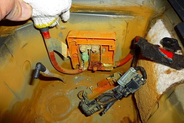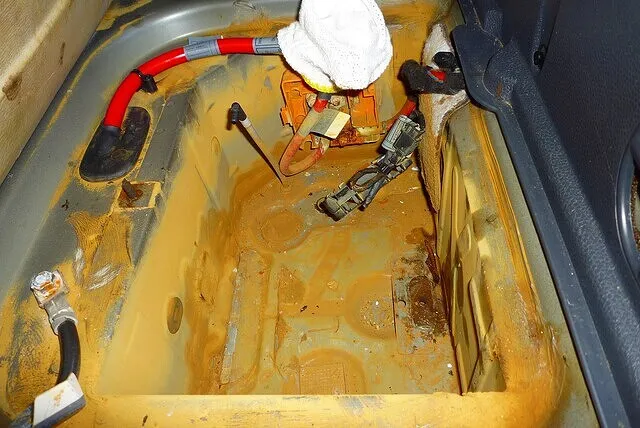 トランクルームフロア下のバッテリーまわりは水分が浸入し錆びた色に。
