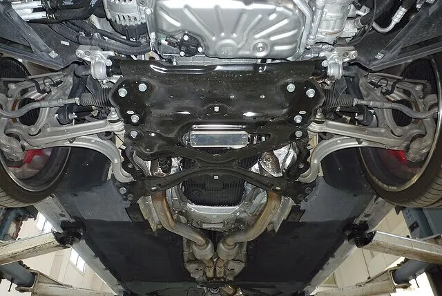 ミッションオイルパンのすぐ下にはフロントサブフレームがかぶっており、まずこれを取り外し。