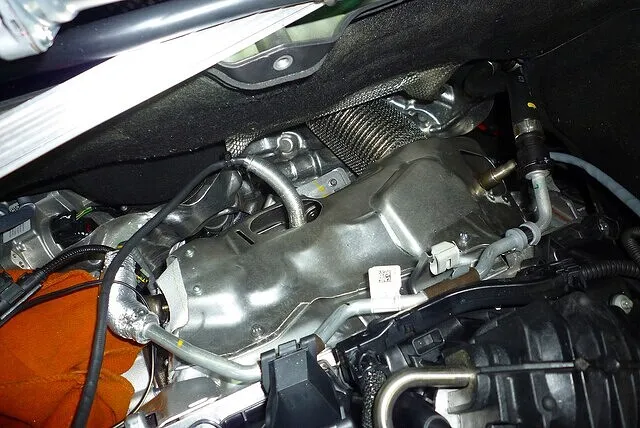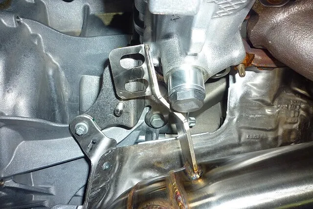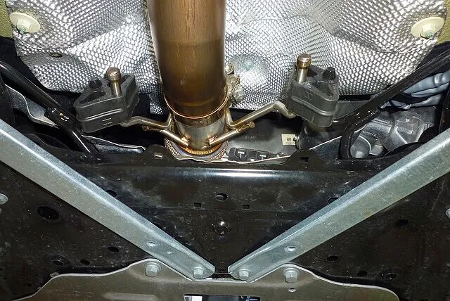 エンジンの後ろ側が排気になるレイアウトのため、ダウンパイプはエンジンルーム再後端の位置に。