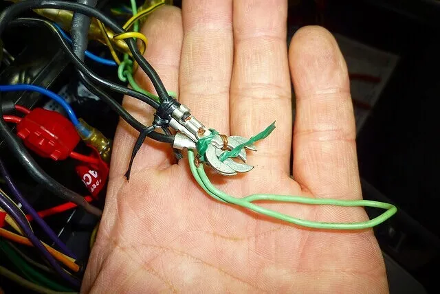 車両の黒い純正配線に後付け電装品のアースをつないであるクルマもあった。