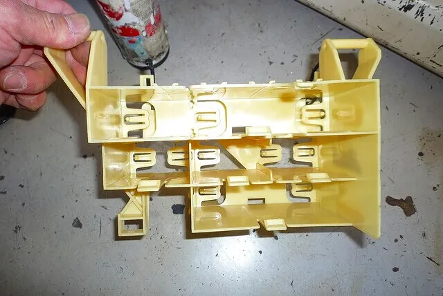 ボックスを取り出して中段を加工。中断を左右に分ける仕切りを撤去し、奥側の部分も切り落とし。