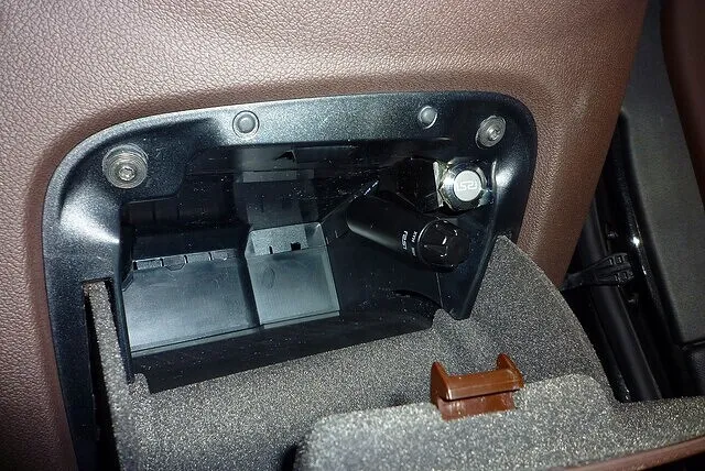 運転席側の小物入れには、シンプルなON/OFFスイッチとサブウーファーシステムのボリューム。