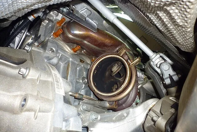 ダウンパイプを外すと、タービンアウトレット開口部が大きいためにターボチャージャー内部が見える。