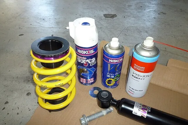 車高調サスペンションを組み込むときは、潤滑材などを各種使う。