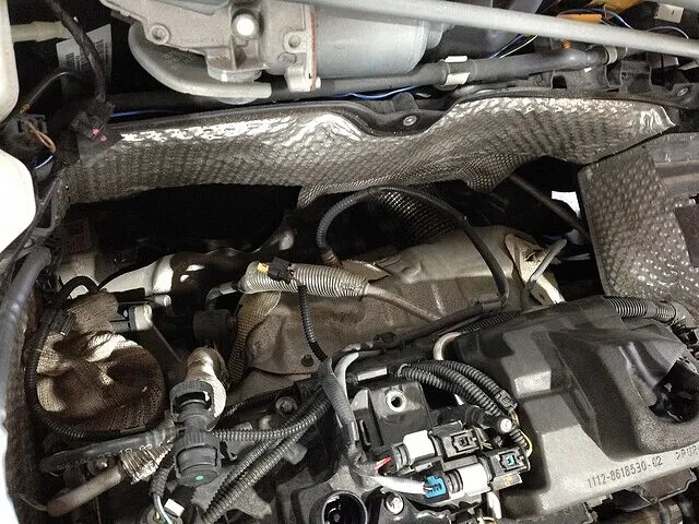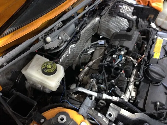 ターボチャージャー含め、かなりの高温になる部分なだけにしっかりと遮熱板でカバーされている。
