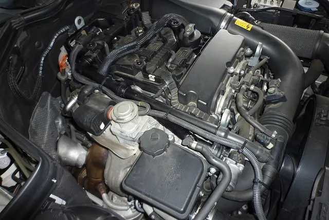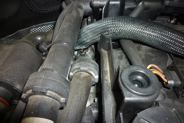 エンジンシリンダーヘッド横を通る、黒い樹脂製の冷却水ライン。