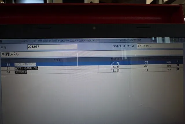 テスターで実測値を確認すると、特にフロント車高が落ちている状態。