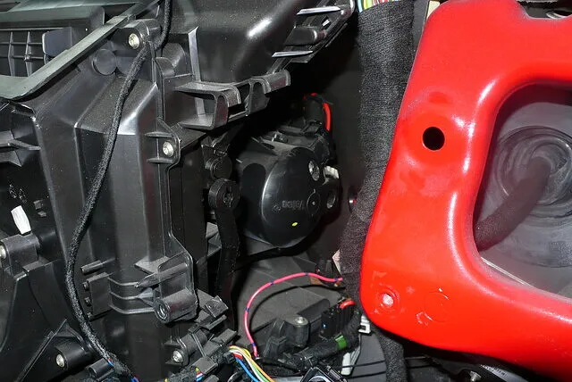 運転席ステアリング奥には赤塗装のボディパネルがステーとして存在。