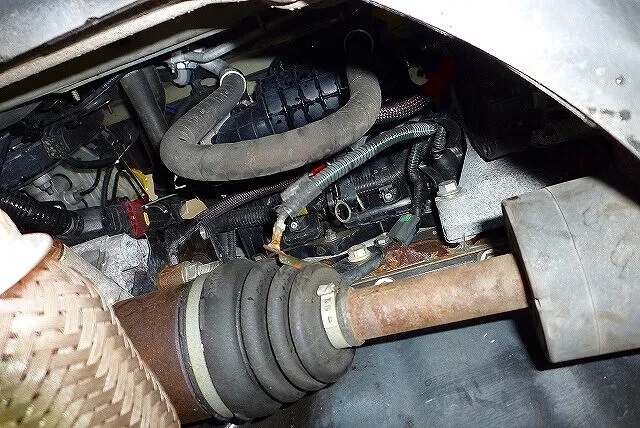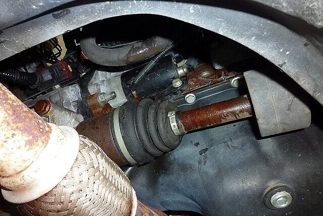 ドライブシャフトの上に見えるのがセルモーター、交換は下から手を伸ばしての作業となる。