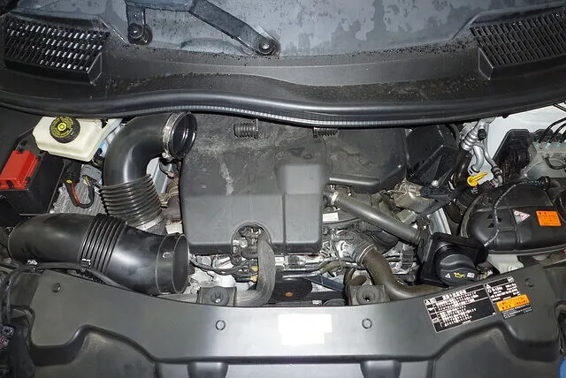 漏れた冷却水はファンベルトにかかり、エンジンルーム各部に飛び散っている状態。