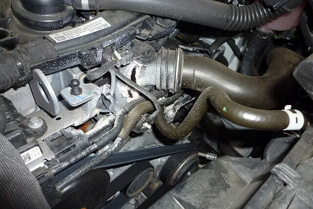 今回の場合はエンジン上部前側にサーモスタットが位置していたため、すぐに漏れ箇所の特定ができた。