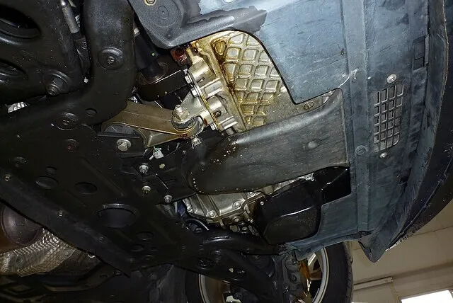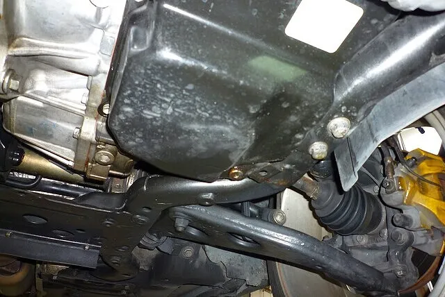 フロントサブフレームの一部とミッションオイルパンが接触している。