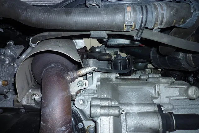 下側からエンジンの前を見た写真。キャタライザーの横あたりに、冷却水が流れた跡が。