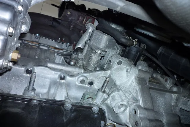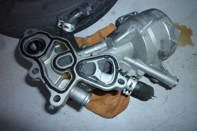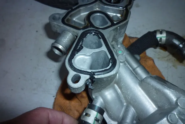 外したオイルフィルターハウジング。ココのガスケットが劣化して水漏れが発生していました。