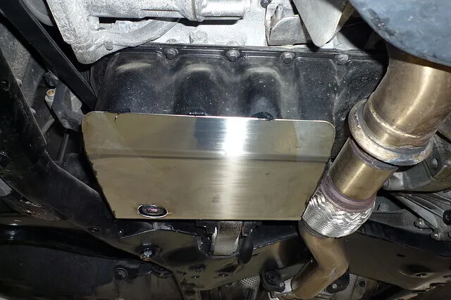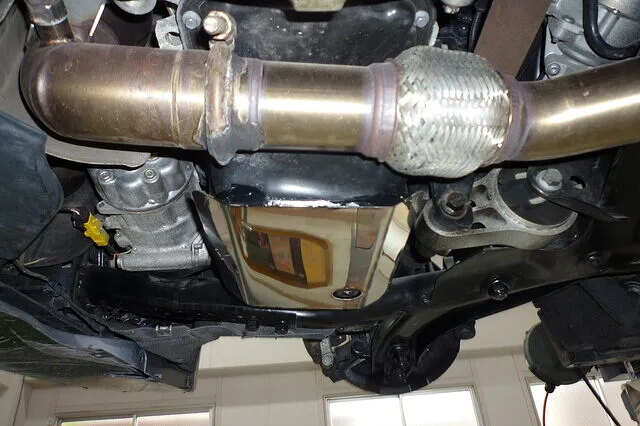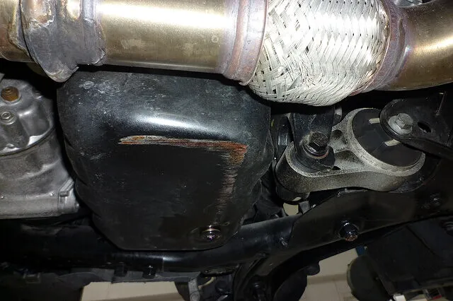 低車高のため、路面にヒットして損傷したオイルパン。 最悪の事態になる前にガードを製作